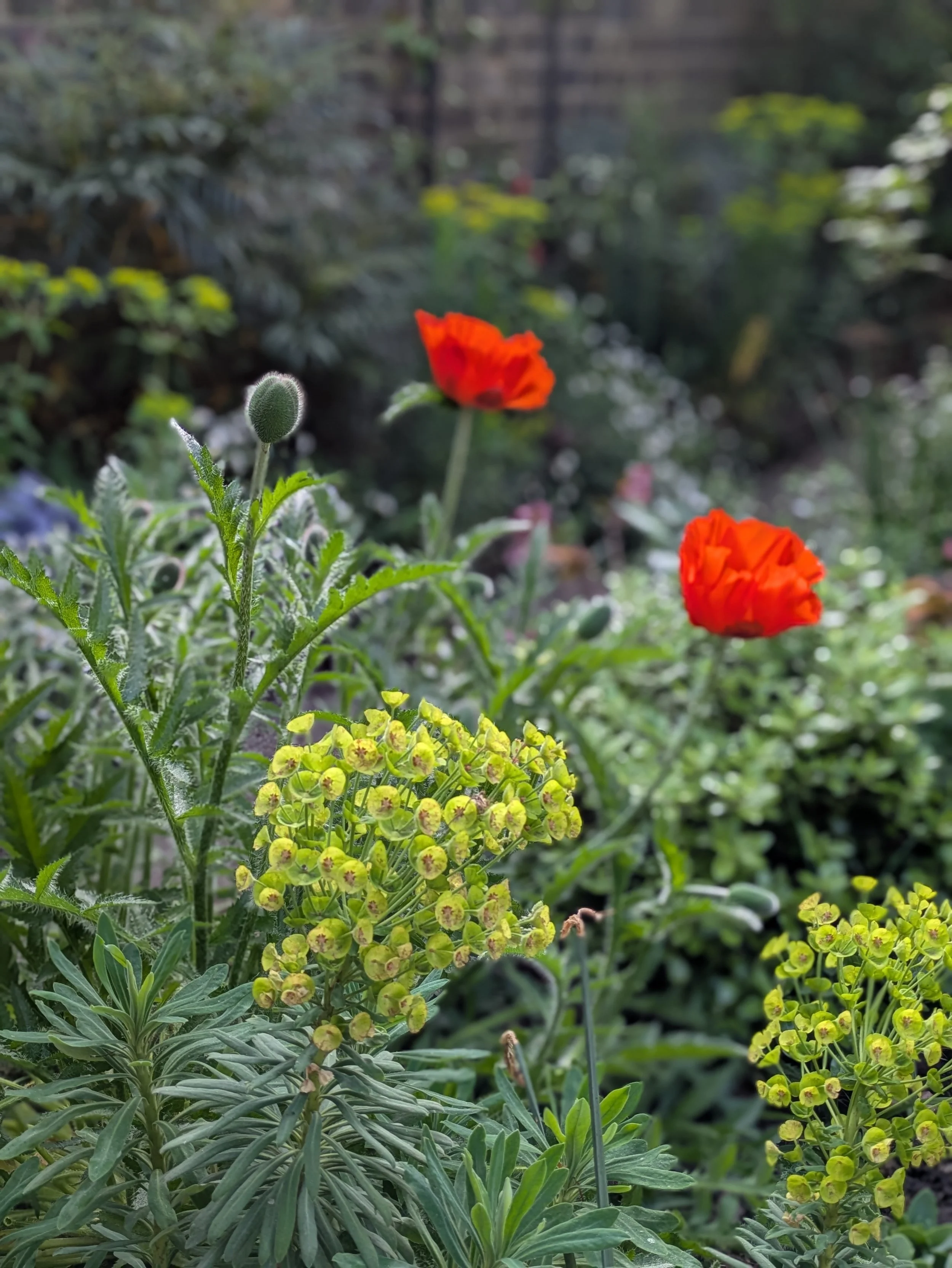 Moody green planting with red poppies